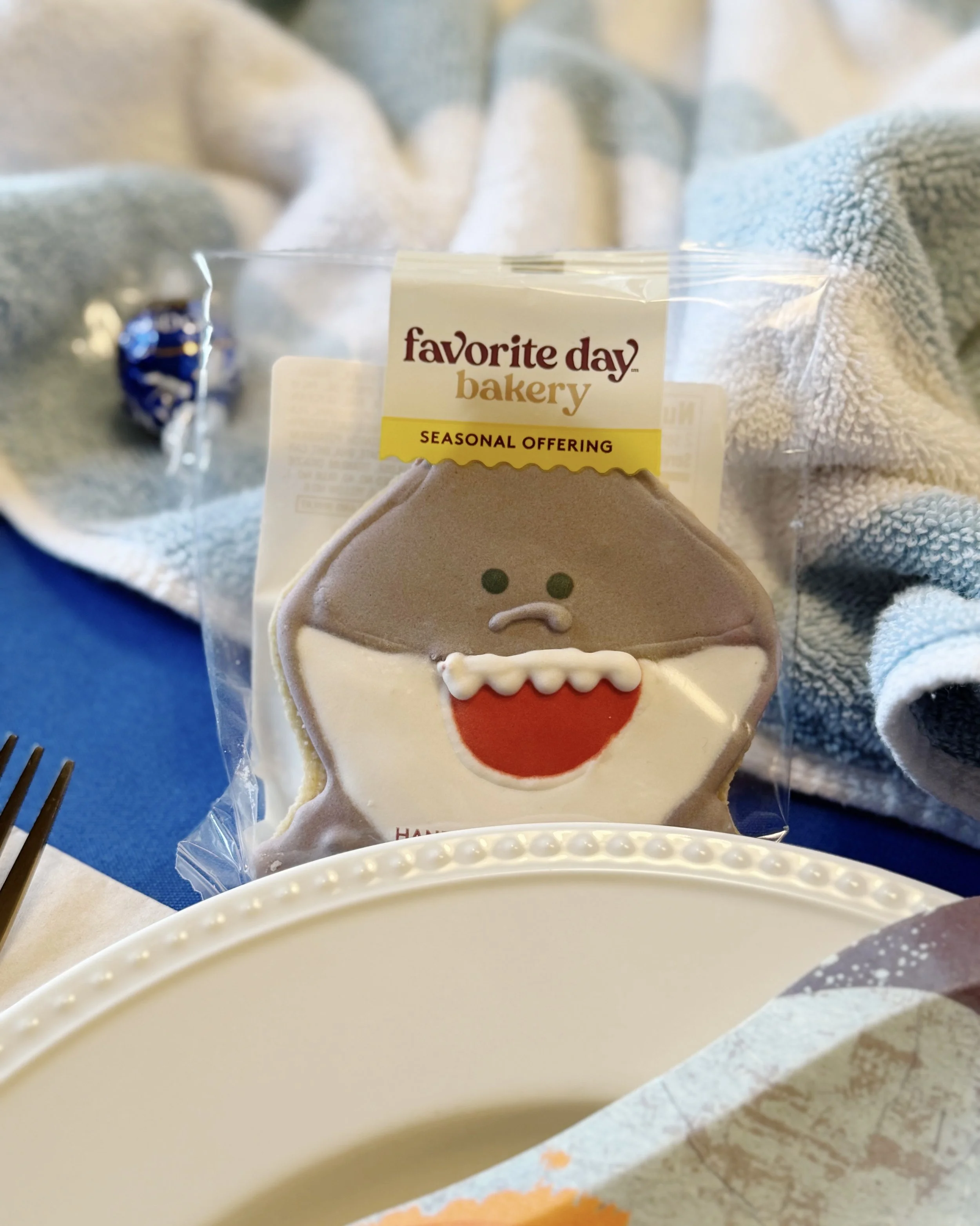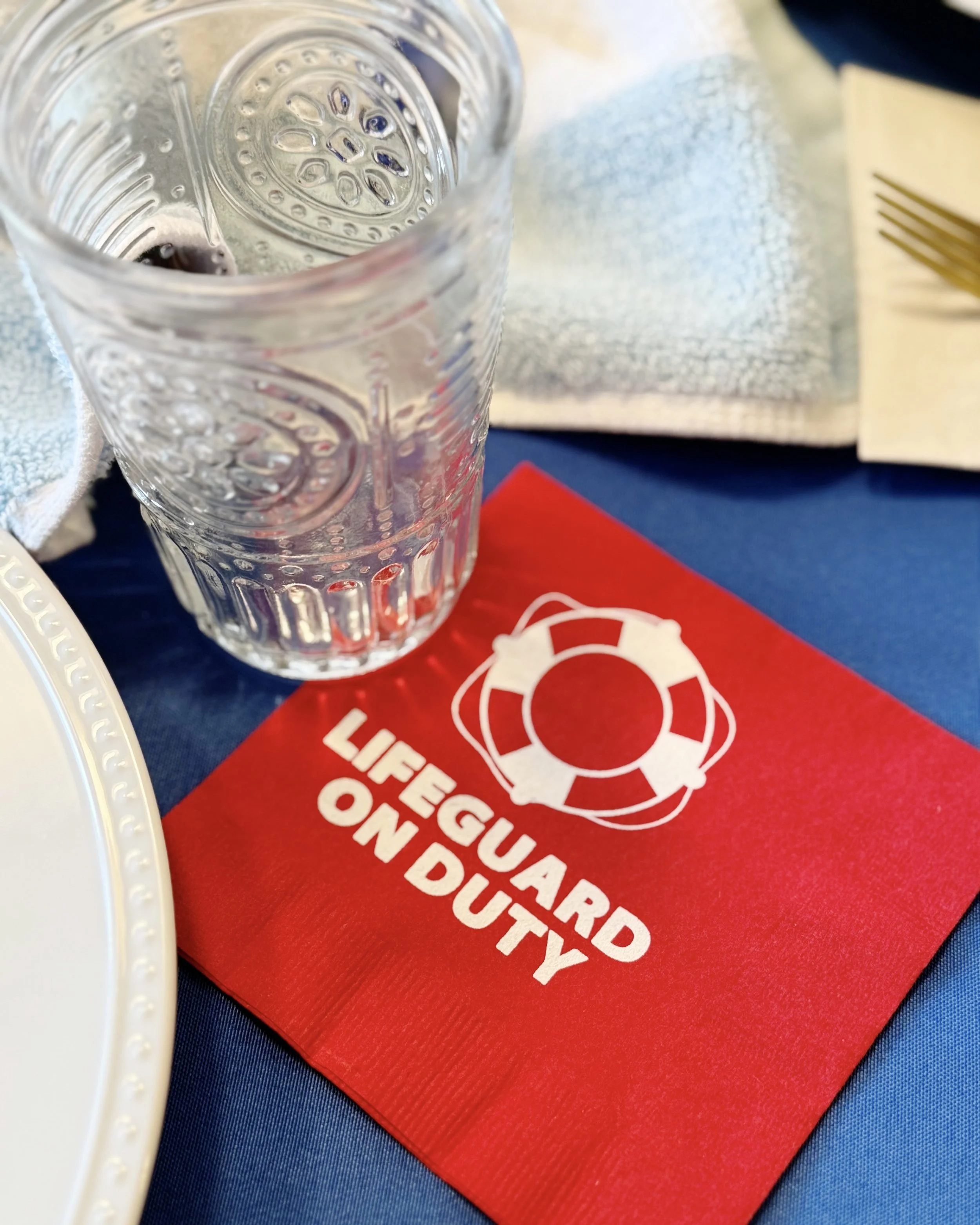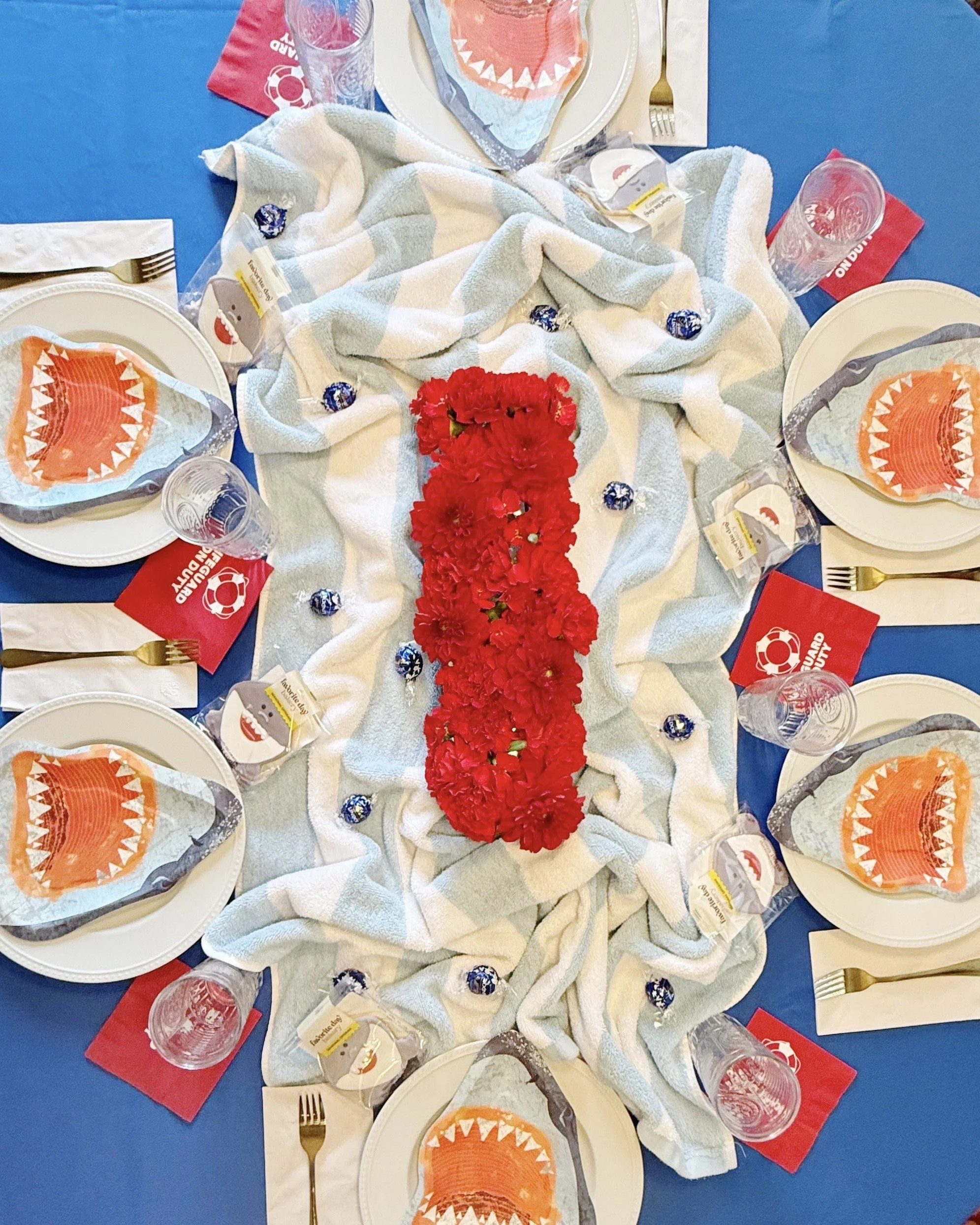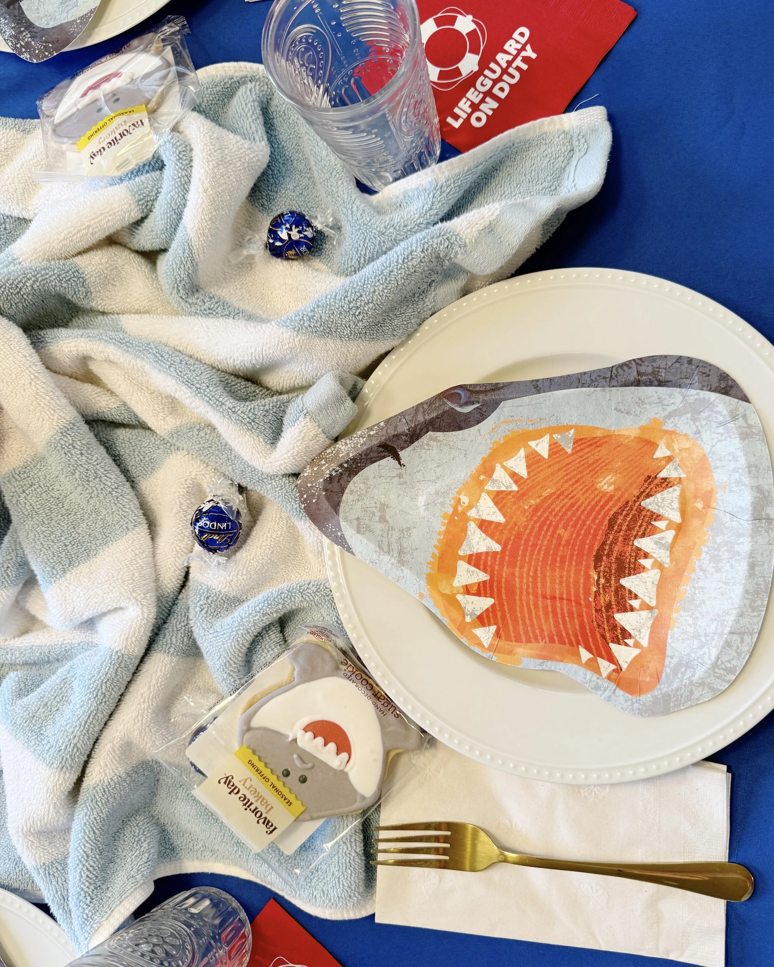 Shark Week is the perfect time to take a bit out of summer boredom and scare up some fun. Change up your table to delight shark lovers of all ages! I used a beach towel and lots of sharky details to create this tablescape. LIfeguard napkins are a must!